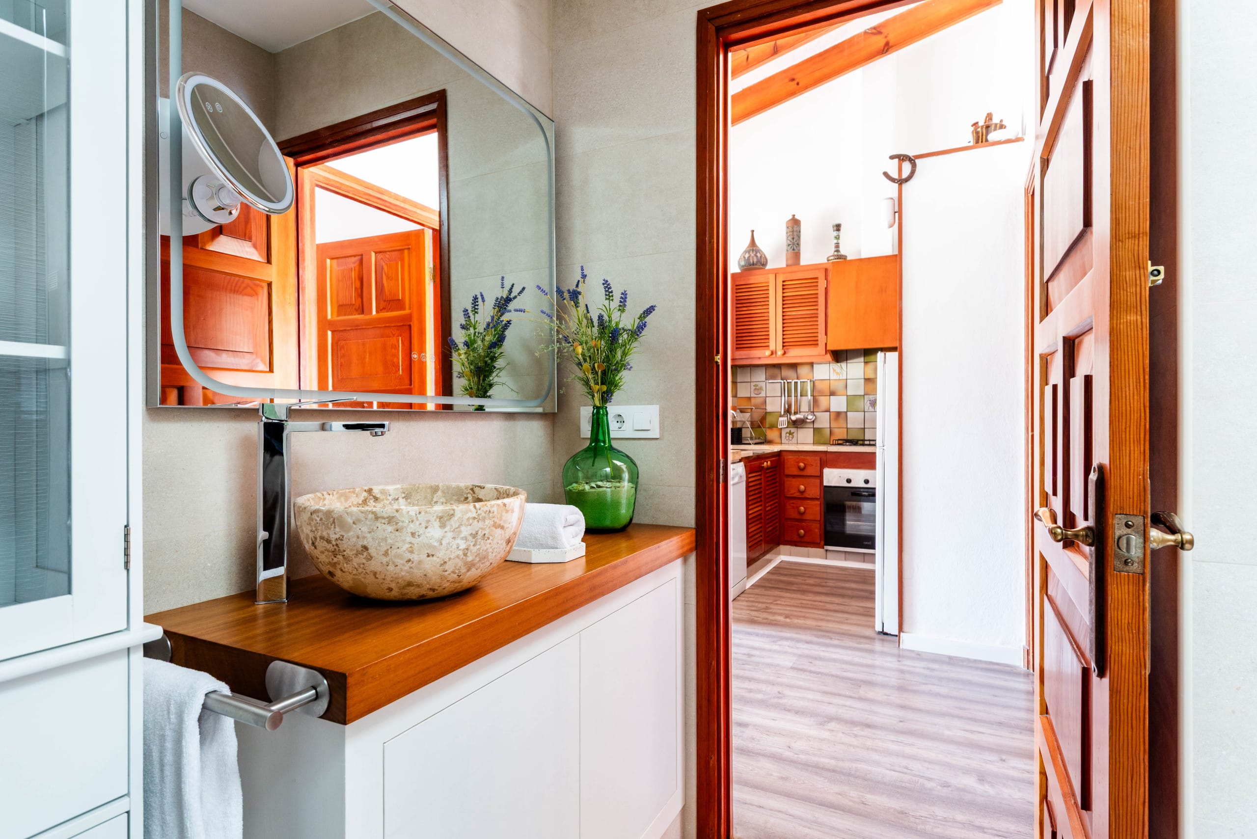 The apartment Ca L’avi I S’avia is located on the beautiful beach of Punta Prima, in the first row of the sea. This privileged location makes it stand out and is an important part of its charm and success. Sitting on the terrace or from the garden you can enjoy a truly wonderful view and atmosphere. It gives the impression that a part of the beach is yours. You have the sea with its turquoise blue color directly in front of you. You will also love the indoor equipment. It has two bedrooms, both with air conditioning, one with a double bed, the other with a trundle bed. The kitchen is fully equipped and very cosy. From the beautiful living room with ceiling fan and dining area you can also admire the views through the wide glass doors to the terrace.